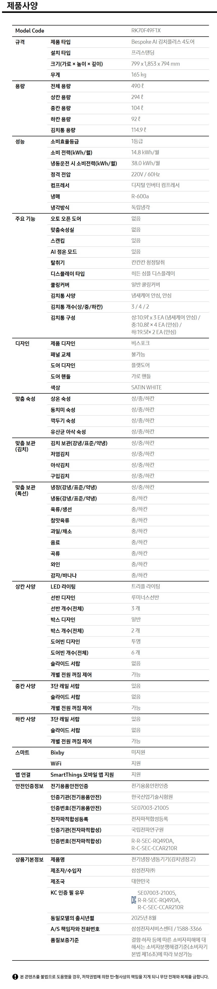 | 품명 | 삼성 비스포크 AI 김치플러스 4도어 490L, 새틴화이트 |