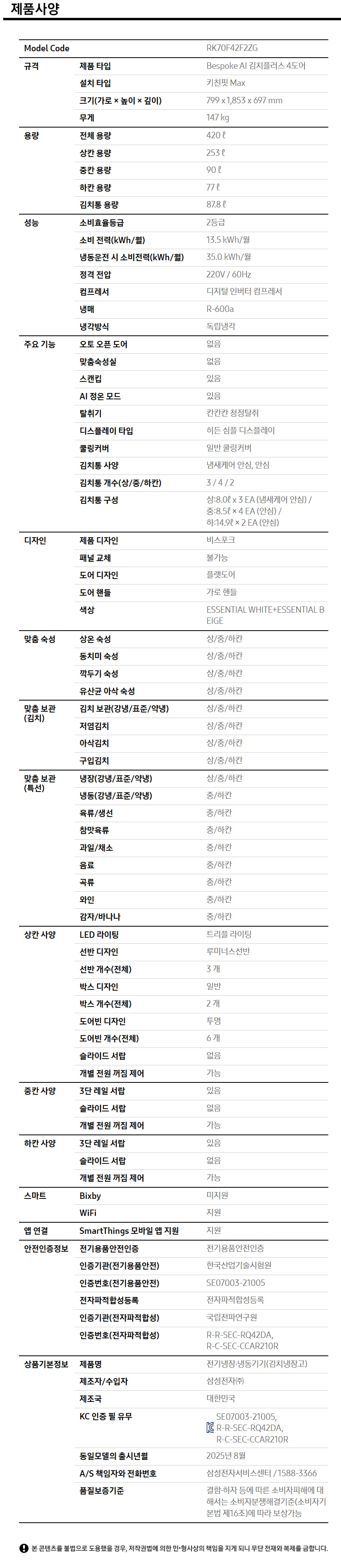 | 품명 | 삼성 비스포크 키친핏 김치냉장고 420L, 에센셜 화이트 &베이지 |