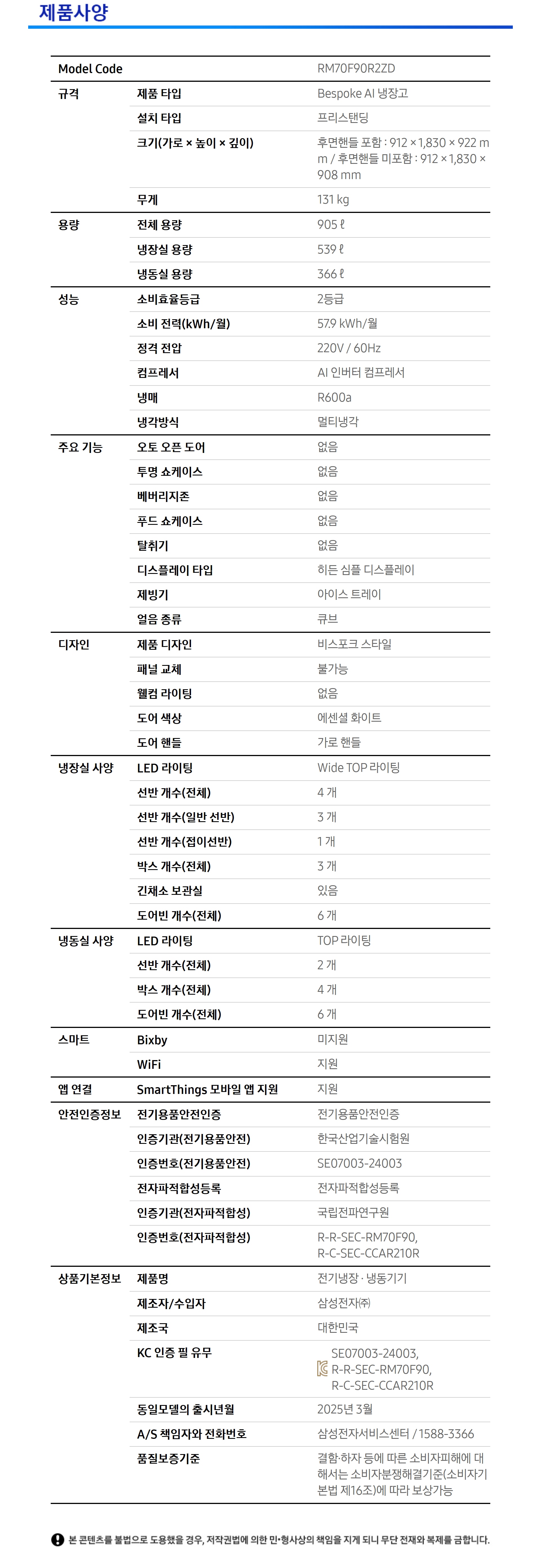 | 품명 | 삼성 BESPOKE AI 냉장고 4도어 905L, 에센셜 화이트 |