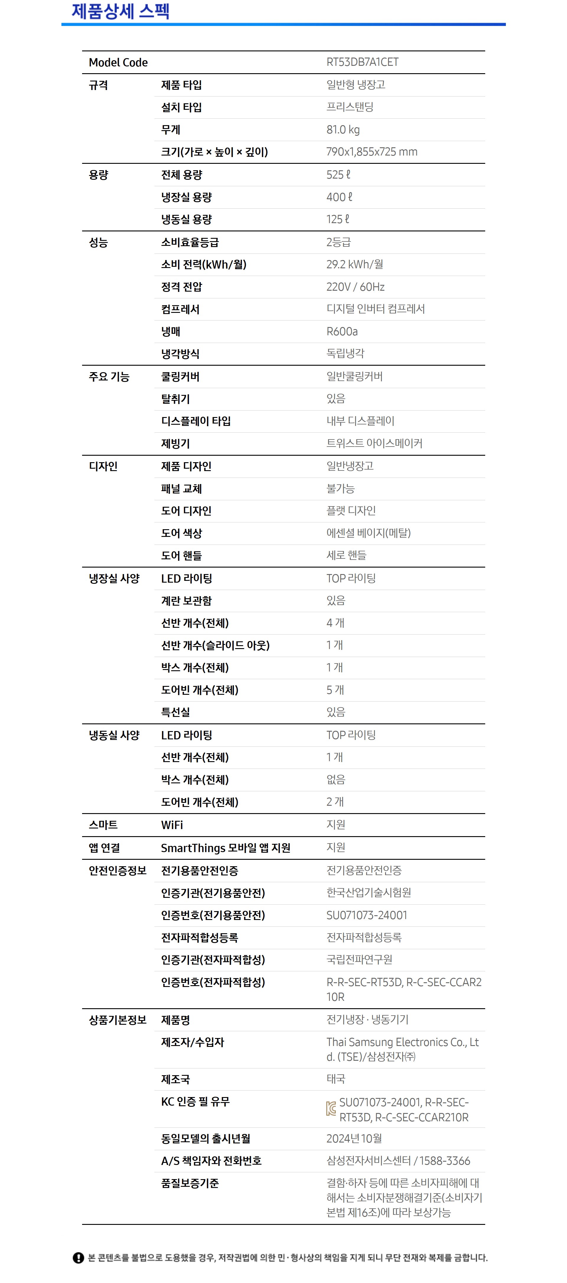 | KC 인증 정보 | 전기용품안전인증번호: SU071073-24001, 전자파 적합성 등록 번호: R-R-SEC-RT53D, R-C-SEC-CCAR210R |
