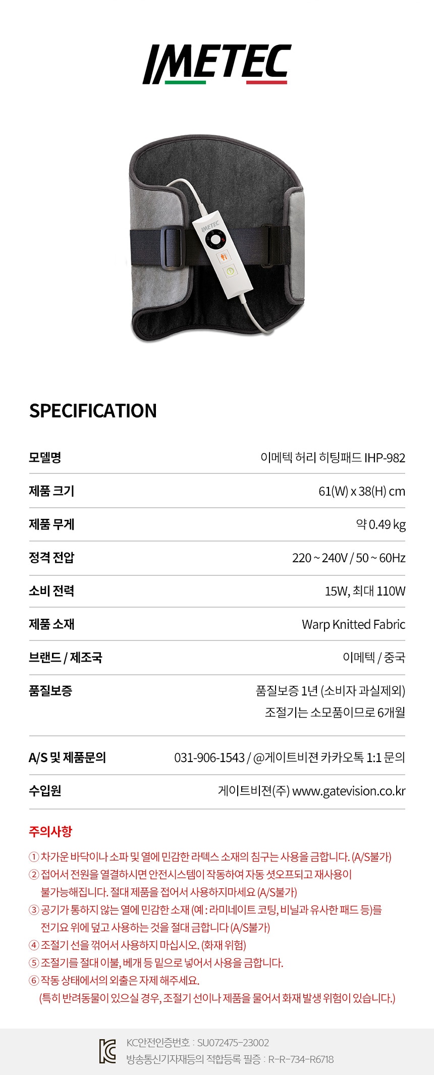 | 품명 | 이메텍 허리 히팅 패드 IHP-982 |