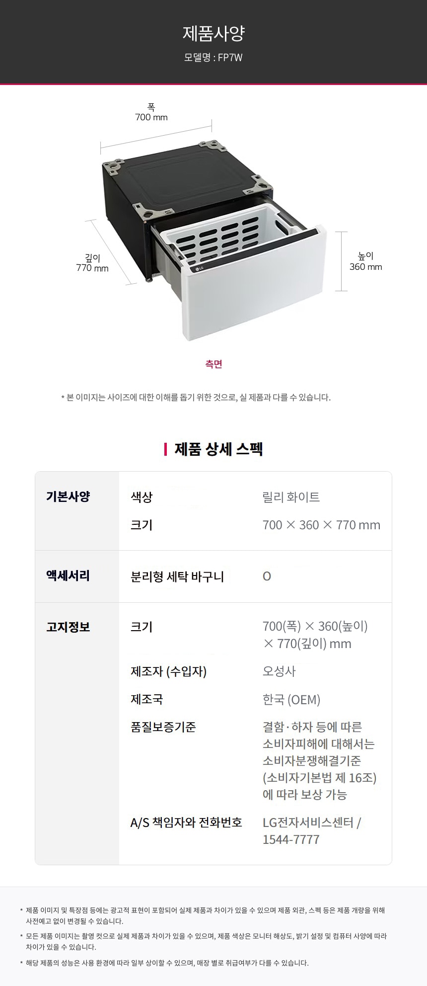| 제조자/수입자 | 워시콤보:LG Electronic / LG전자㈜ 수납함: 오성사 / LG Electronic |