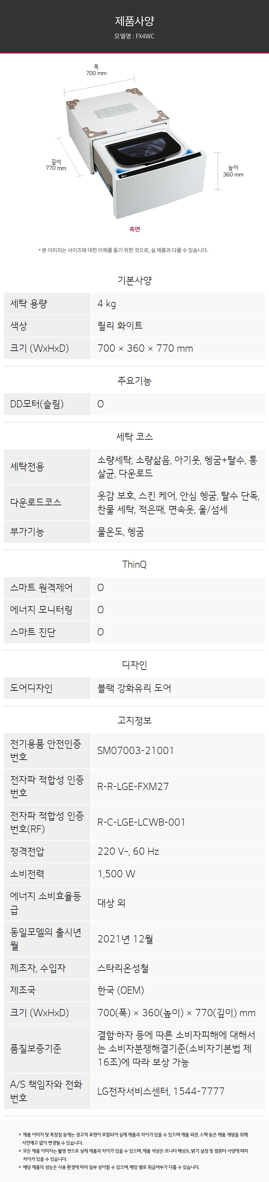 | KC 인증 정보 | 전기용품안전인증번호: 워시콤보 SM07003-24001, 미니워시 SM07003-21001 전자파 적합성 등록 번호: 워시콤보 R-R-LGE-FXHP, 미니워시 R-R-LGE-FXM27, R-C-LGE-LCWB-001 |