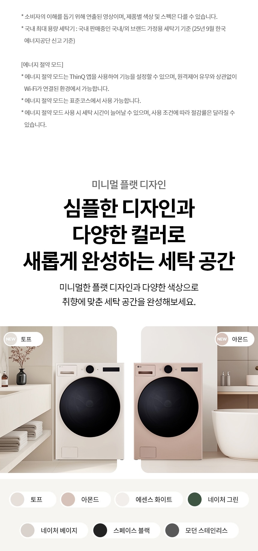 | 크기 | 세탁기: 가로 700 x 세로 830 x 높이 990mm, 무게 95kg 건조기: 가로 700 x 세로 824 x 높이 990mm, 무게 76.2kg |