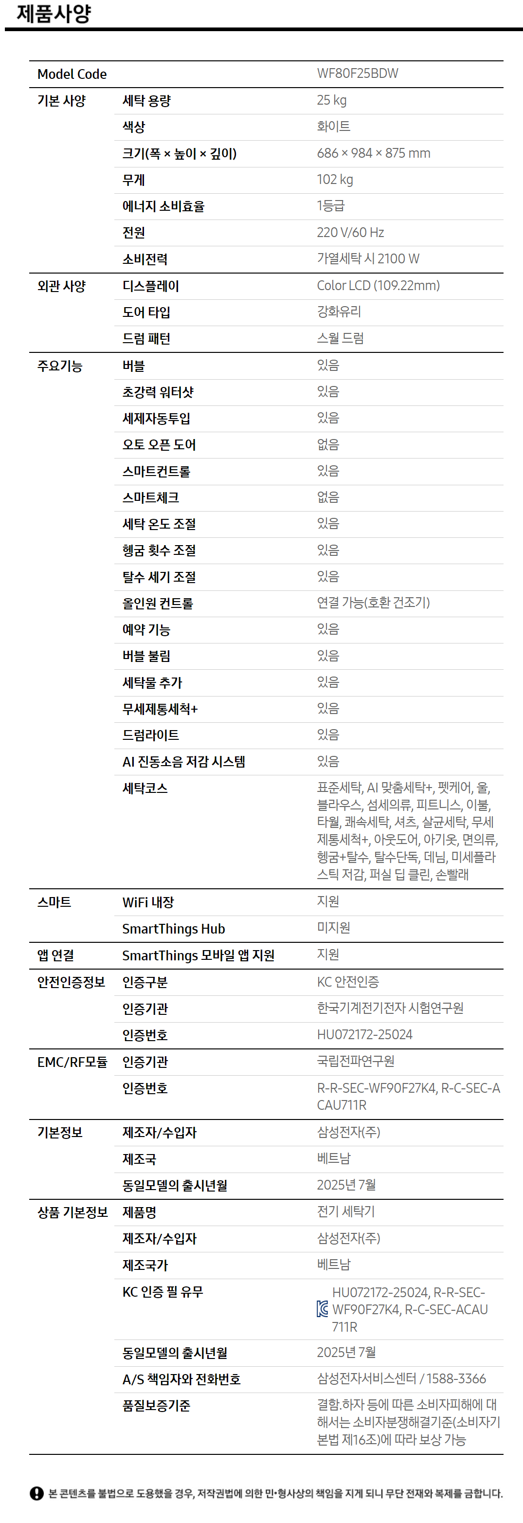 | 품명 | 삼성 비스포크 그랑데 AI 드럼 세탁기25kg- 화이트 |