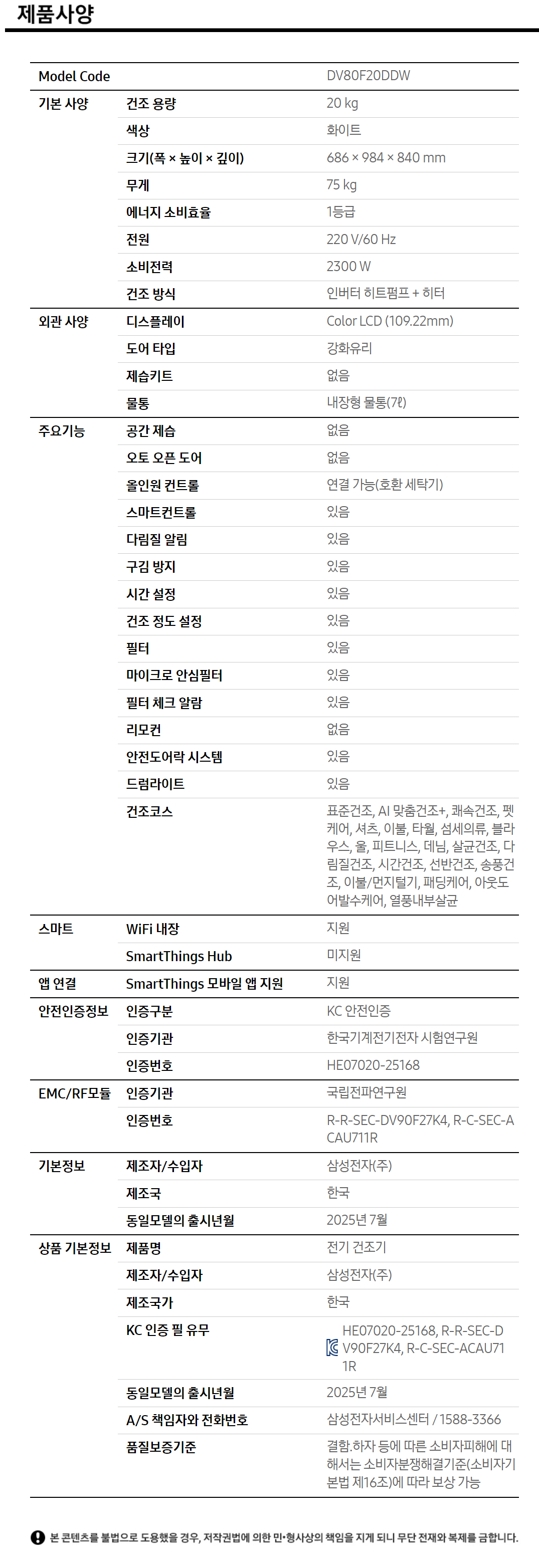 | 모델명 | 세트: WF80F2520BDHW 세탁기:WF80F25BDW 건조기: DV80F20DDW |