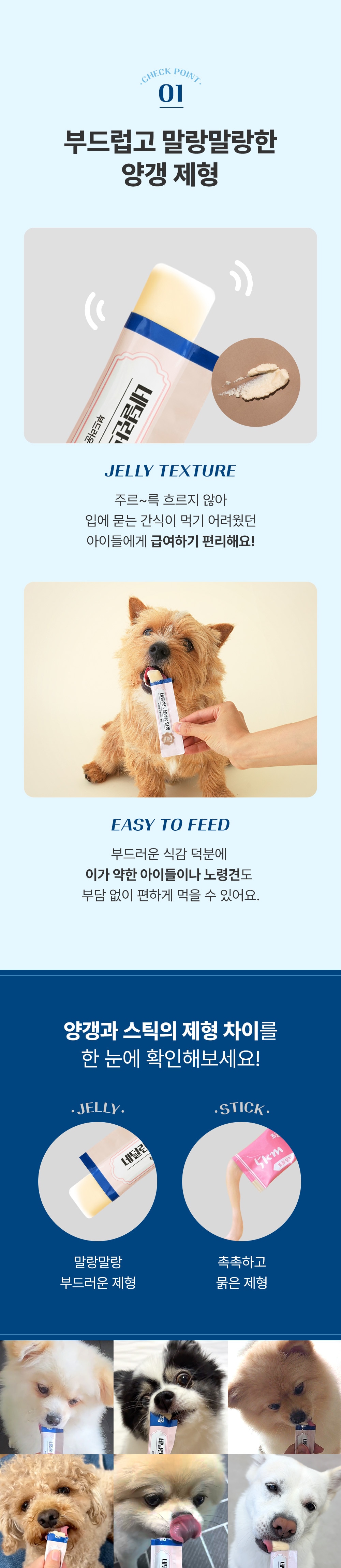 흐르지 않는 말랑한 제형으로 깔끔하게 먹을 수 있습니다. 국내산 닭가슴살과 고소한 산양유가 들어가 기호성이 좋은 간식입니다. 관절, 장, 피모 3 종류의 제품이 들어가 있어 다양한 맛과 건강을 챙길 수 있습니다.