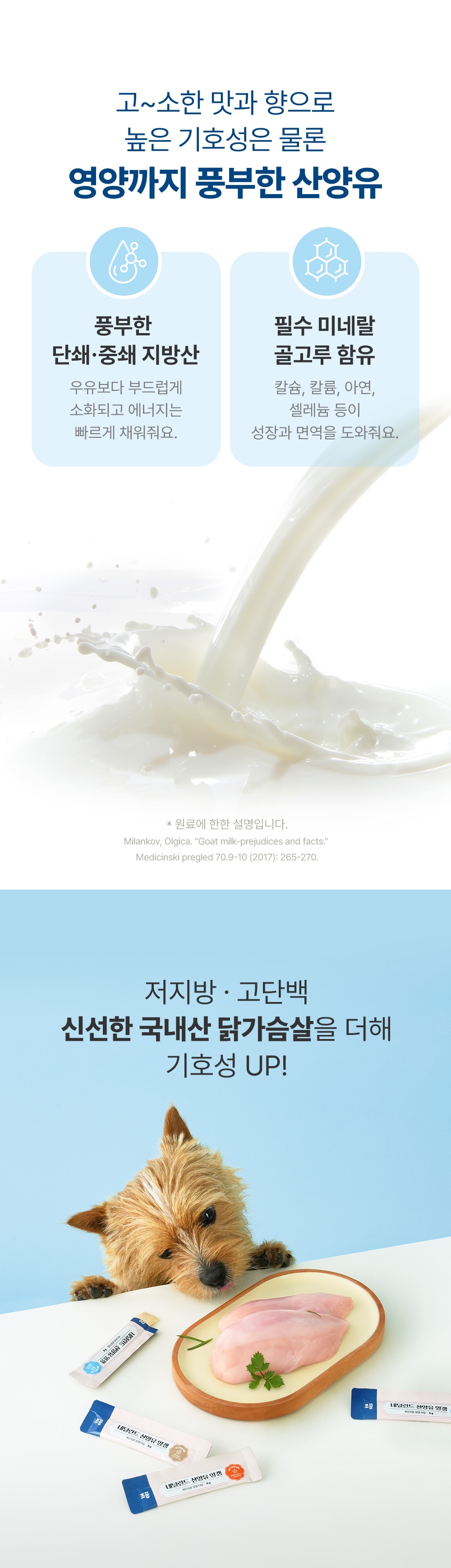 - 피모: 국내산 닭가슴살, 고소한 네덜란드산 산양유, 피부 건강에 도움을 주는 콜라겐, 피모 건강에 도움을 주는 오메가-3, 피부 염증 완화에 도움을 주는 코코넛오일로 만들었습니다.