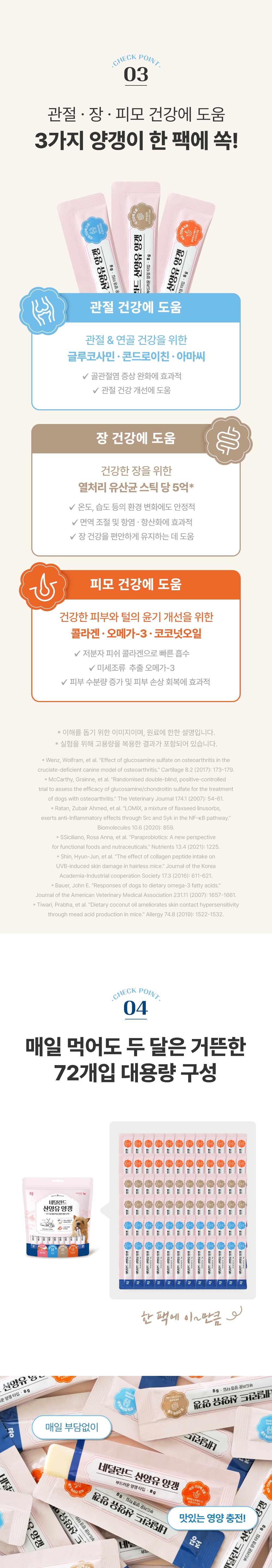 - 관절: 국내산 닭가슴살 고소한 네덜란드산 산양유, 관절 건강에 도움을 주는 글루코사민과 콘드로이친, 염증 완화에 도움을 주는 아마씨로 만들어습니다.