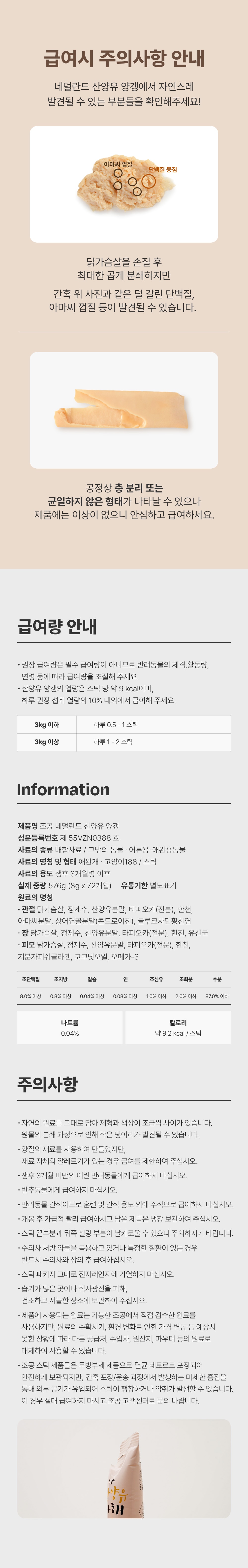 - 장: 닭가슴살, 정제수, 산양유분말, 타피오카(전분), 한천, 유산균