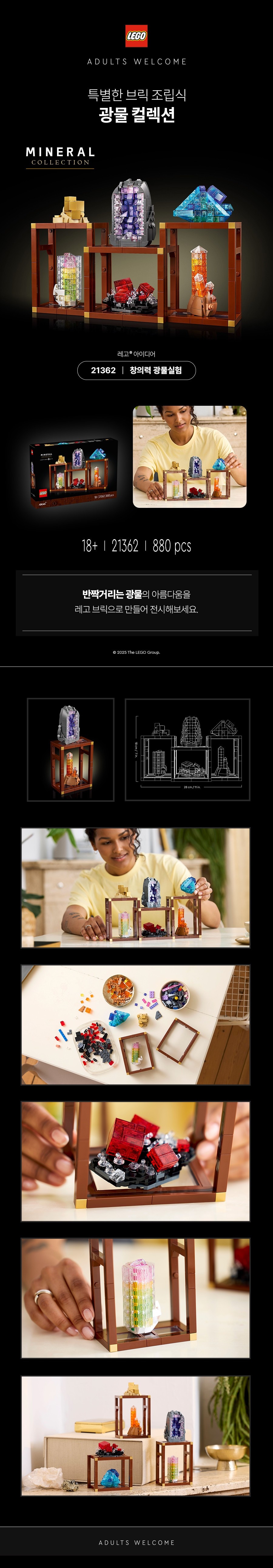 - 몰입감 넘치는 창의적 경험 – 투명한 레고® 브릭을 연결하여 광물의 색상과 광채를 재현하며 자신만의 오롯한 시간에 빠져보시죠