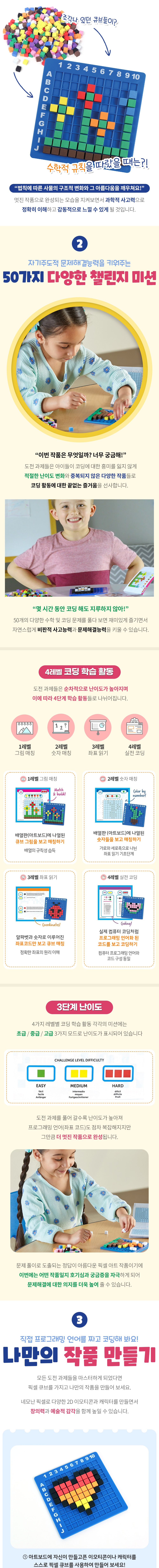 - 구성품 : 픽셀큐브 400개(10가지 색상), 픽셀 아트 보드 1개, 챌린지북 1권(50가지 미션)