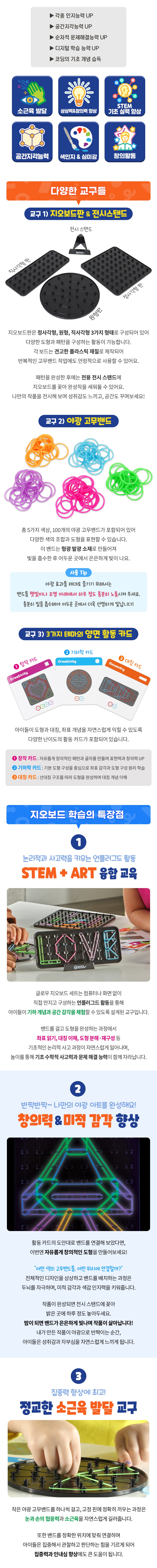 - 구성품 : 지오보드 판 3개, 전시 스탠드 1개, 야광 고무밴드 100개(5가지 색상), 양면 활동 카드 18장