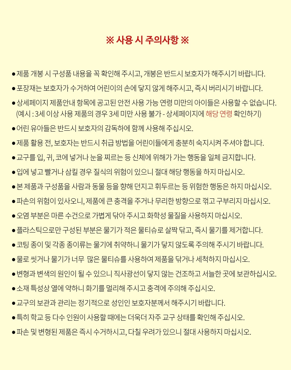 | 취급 방법 및 취급 시 주의사항 | 제품 개봉 시 구성품 내용을 꼭 확인해주시고 개봉은 반드시 보호자가 해주시기 바랍니다. 포장재는 보호자가 수거하여 어린이의 손에 닿지 않게 해주시고, 즉시 버리시기 바랍니다. 상세페이지 제품안내 항목에 공고된 안전 사용 가능 연령 미만의 아이들은 사용할 수 없습니다. 어린 유아들은 반드시 보호자의 감독 하에 함께 사용해 주십시오. 제품 활용 전, 보호자는 반드시 취급 방법을 어린이들에게 충분히 숙지시켜 주셔야 합니다. 교구를 입, 귀, 코에 넣거나 눈을 찌르는 등 신체에 위해가 가는 행동을 일체 금지합니다. 입에 넣고 빨거나 삼킬 경우 질식의 위험이 있으니 절대 해당 행동을 하지 마십시오. 본 제품과 구성품을 사람과 동물 등을 향해 던지고 휘두르는 등 위험한 행동은 하지 마십시오. 파손의 위험이 있사오니, 제품에 큰 충격을 주거나 무리한 방향으로 꺾고 구부리지 마십시오. 오염 부분은 마른 수건으로 가볍게 닦아 주시고 화학성 물질을 사용하지 마십시오. 플라스틱으로만 구성된 부분은 물기가 적은 물티슈로 살짝 닦고, 즉시 물기를 제거합니다. 코팅 종이 및 각종 종이류는 물기에 취약하니 물기가 닿지 않도록 주의해 주시기 바랍니다. 물로 씻거나 물기가 너무 많은 물티슈를 사용하여 제품을 닦거나 세척하지 마십시오. 변형과 변색의 원인이 될 수 있으니 직사광선이 닿지 않는 건조하고 서늘한 곳에 보관하십시오. 소재 특성상 열에 약하니 화기를 멀리해 주시고 충격에 주의해 주십시오. 교구의 보관과 관리는 정기적으로 성인인 보호자분께서 해주시기 바랍니다. 특히 학교 등 다수 인원이 사용할 때에는 더욱더 자주 교구 상태를 확인해 주십시오. 파손 및 변형된 제품은 즉시 수거하시고, 다칠 우려가 있으니 절대 사용하지 마십시오. |