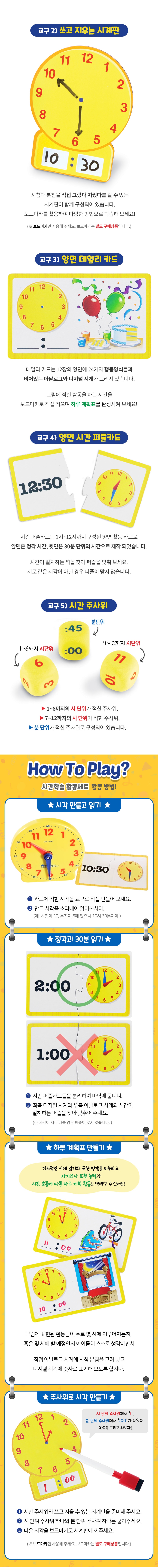 - 구성품 : 시계 모형 1개, 쓰고 지우는 시계판 1개, 양면 데일리 카드 12장, 양면 시간 퍼즐카드 24장, 시간 주사위 3개