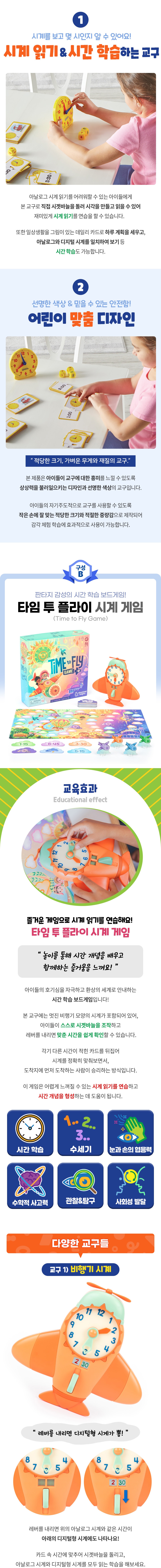 | 사용연령 또는 권장사용연령 | 시간학습 활동세트 - 5세 이상 타임 투 플라이 시계 게임 - 4세 이상 |
