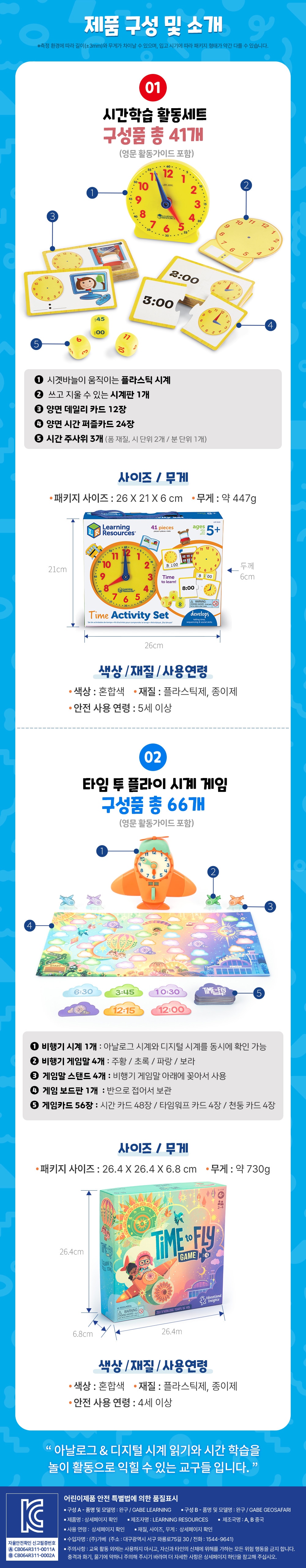 | KC 인증 정보 | 안전확인 신고 확인증 번호: CB064R311-0011A(시간학습 활동세트) 안전확인 신고 확인증 번호: CB064R311-0002A(타임 투 플라이 시계 게임) |