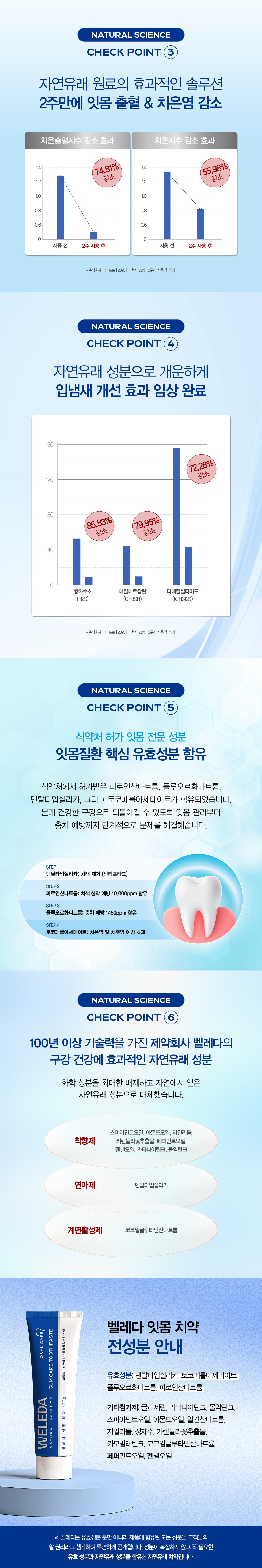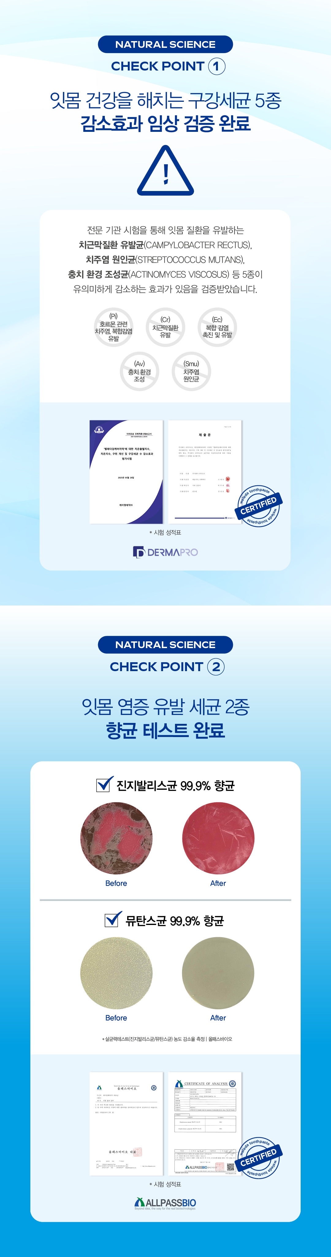 - 덴탈타입실리카, 피로인산나트륨, 플루오르화나트륨, 토코페롤아세테이트 등 잇몸질환에 효과적인 핵심 유효성분 함유
