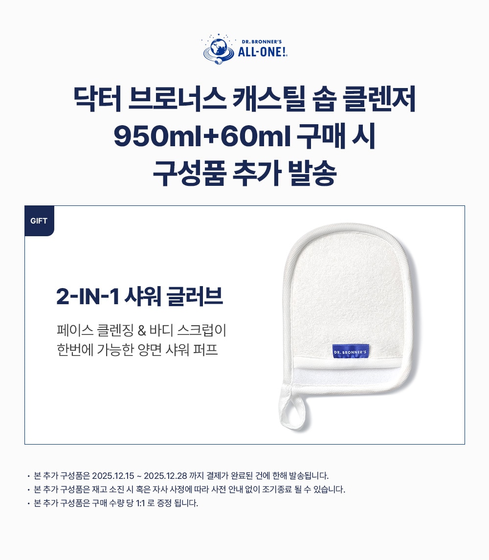 | 용량 또는 중량 | 닥터 브로너스 퓨어 캐스틸 솝 950ml + 60ml, 전용펌프, 거품용기 *2025/12/15~2025/12/28 추가 구성품 : 샤워 글러브 |