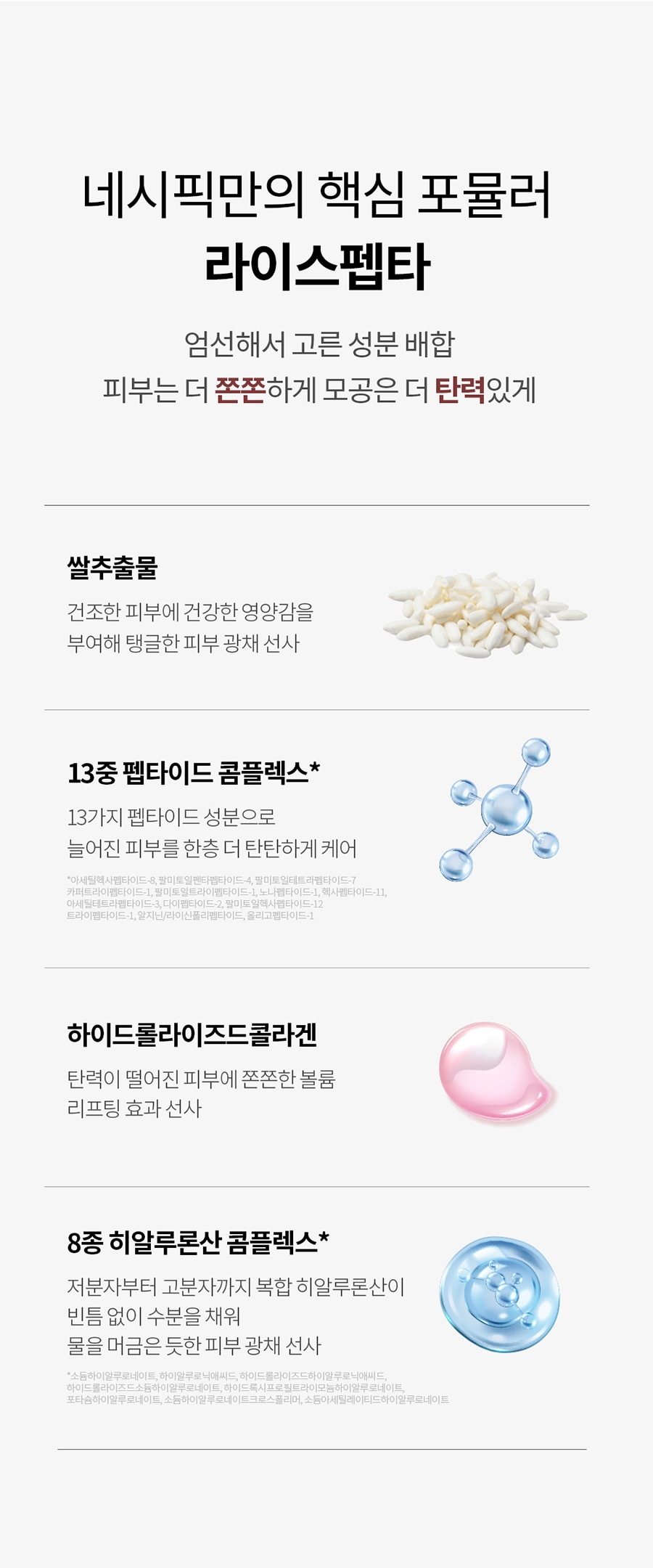 | 화장품법에 따라 기재.표시하여야 하는 모든성분 | 정제수, 글리세린, 폴리비닐알코올, 하이드로제네이티드폴리아이소부텐, 부틸렌글라이콜, 폴리솔베이트80, 식물성오일, 폴리글리세릴-4카프레이트, 1,2-헥산다이올, 알진, 펙틴,소듐폴리스타이렌설포네이트, 호호바씨오일, 솔비탄세스퀴올리에이트, 셀룰로오스검, 시트릭애씨드, 하이드록시에틸셀룰로오스,피브이피, 스위트아몬드오일, 카프릴릴글라이콜, 소듐시트레이트,메도우폼씨오일, 알란토인, 다이스테아다이모늄헥토라이트, 해바라기씨오일, 스쿠알란, 토코페롤, 하이드롤라이즈드콜라겐(540 ppm), 에틸헥실글리세린, 다이소듐이디티에이, 하이드로제네이티드레시틴, 폴리글리세릴-10올리에이트, 폴리글리세릴-3,메틸글루코오스다이스테아레이트, 백미꽃추출물, 효모/쌀발효여과물, 펜틸렌글라이콜, 쌀추출물(10 ppm), 병풀잎소포, 소듐하이알루로네이트, 아세틸헥사펩타이드-8(0.55 ppm), 아세틸테트라펩타이드-3(0.55 ppm), 알지닌/라이신폴리펩타이드(0.55 ppm),카퍼트라이펩타이드-1(0.55 ppm), 다이펩타이드-2(0.55 ppm),헥사펩타이드-11(0.55 ppm), 노나펩타이드-1(0.55 ppm), 올리고펩타이드-1(0.55 ppm), 팔미토일헥사펩타이드-12(0.55 ppm),팔미토일펜타펩타이드-4(0.55 ppm), 팔미토일테트라펩타이드-7(0.55 ppm), 팔미토일트라이펩타이드-1(0.55 ppm), 트라이펩타이드-1(0.55 ppm), 하이알루로닉애씨드, 하이드롤라이즈드,하이알루로닉애씨드, 하이드롤라이즈드소듐하이알루로네이트,하이드록시프로필트라이모늄하이알루로네이트, 포타슘하이알루로네이트, 소듐하이알루로네이트크로스폴리머, 소듐아세틸레이티드하이알루로네이트 |