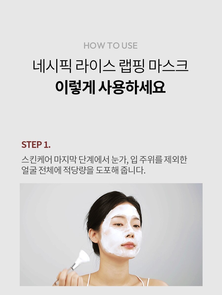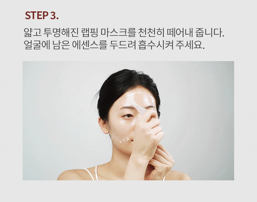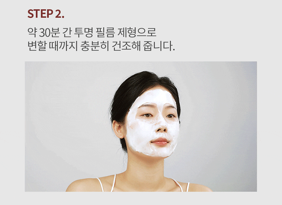 | 사용방법 | 세안 후 스킨케어 마지막 단계에서 눈과 입을 제외한 얼굴 전체에 적당량을 도포해 줍니다. 약 20-30분 후 투명한 막이 생길 때까지 충분히 건조해 준 뒤 가장자리부터 부드럽게 떼어냅니다. 얼굴에 남아있는 에센스를 가볍게 두드려 흡수시켜 줍니다. |