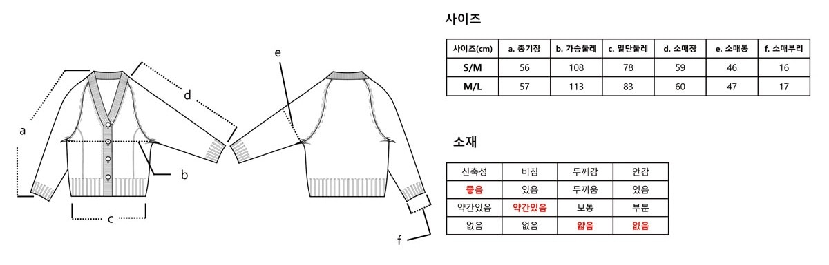 | 크기 | S/M - 총장 56cm, 가슴둘레 108cm, 밑단둘레 78cm, 소매기장 59cm M/L - 총장 57cm, 가슴둘레 113cm, 밑단둘레 83cm, 소매기장 60cm 제품 실측 사이즈로 재는 방식에 따라 약간의 오차가 있을 수 있습니다. |