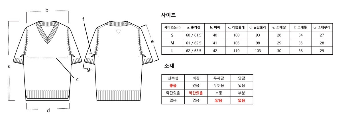 | 크기 | S - 총장 61.5cm, 어깨너비 40cm, 가슴둘레 100cm, 밑단둘레 93cm, 소매기장 28cm M - 총장 62.5cm, 어깨너비 41cm, 가슴둘레 105cm, 밑단둘레 98cm, 소매기장 29cm L - 총장 63.5cm, 어깨너비 42cm, 가슴둘레 110cm, 밑단둘레 103cm, 소매기장 30cm 제품 실측 사이즈로 재는 방식에 따라 약간의 오차가 있을 수 있습니다. |
