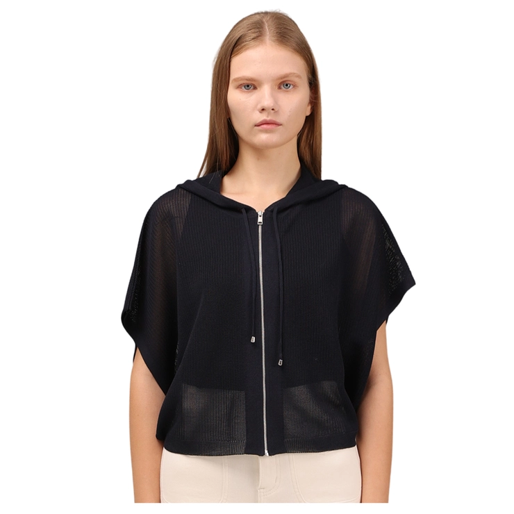 - 크로셰 조직감으로 짜여진 케이프 스타일 후드 집업 니트