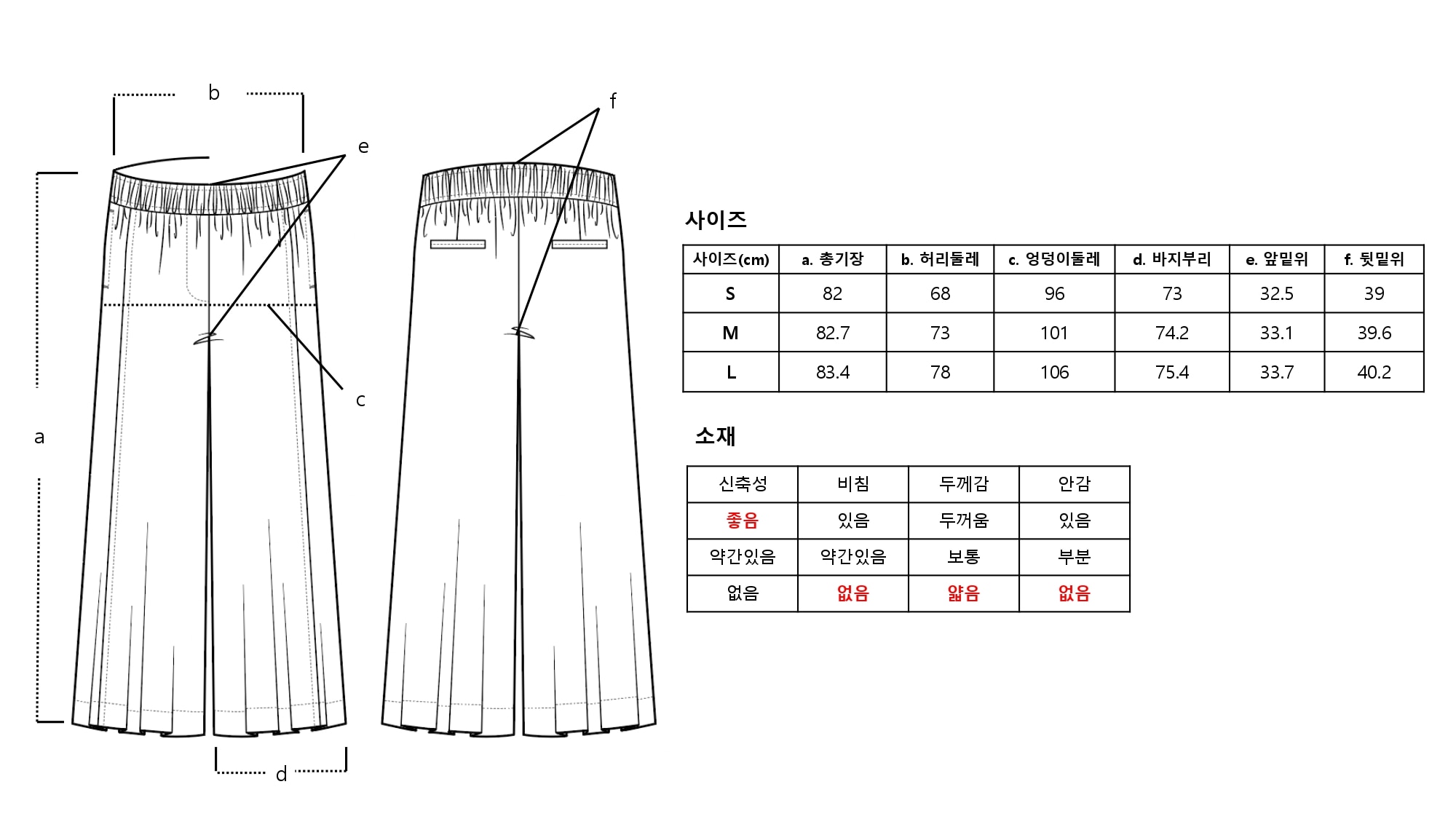 | 크기 | S - 총장 82cm, 허리둘레 68cm, 앞밑위 32.5cm, 힙둘레 96cm, 바지부리 73cm M - 총장 82.7cm, 허리둘레 73cm, 앞밑위 33.1cm, 힙둘레 101cm, 바지부리 74.2cm L - 총장 83.4cm, 허리둘레 78cm, 앞밑위 33.7cm, 힙둘레 106cm, 바지부리 75.4cm 제품 실측 사이즈로 재는 방식에 따라 약간의 오차가 있을 수 있습니다. |