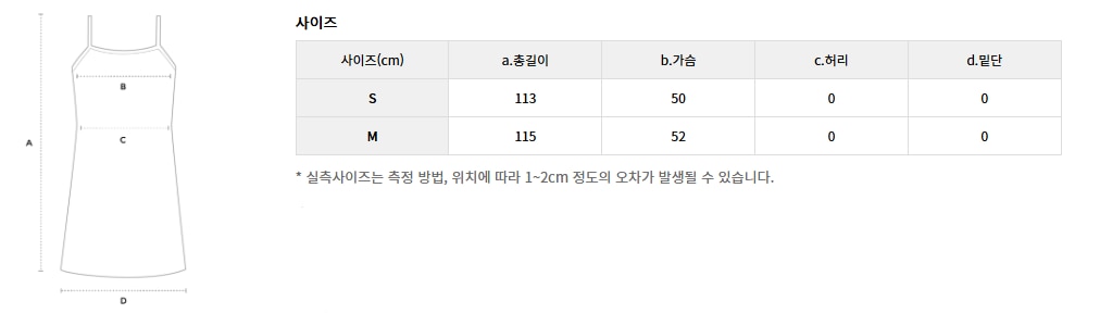 | 크기 | S/M- 총장 : 112.4cm, 가슴둘레 : 99cm M/L- 총장 : 114.7cm, 가슴둘레 : 104.1cm 사이즈의 경우 재는 방식에 따라 약간의 오차가 있을 수 있습니다. |