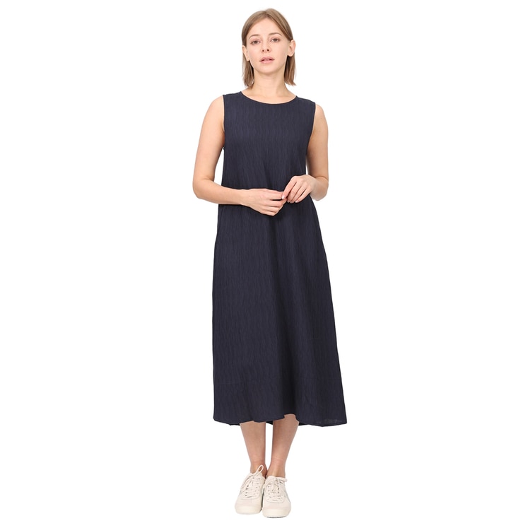 - 입체감 있는 주름 텍스처가 돋보이는 슬리브리스 롱 원피스
