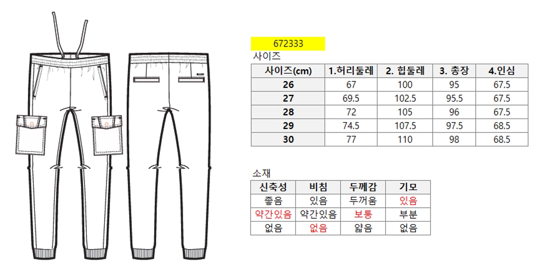 - 카고 포켓 디테일로 워크웨어 디자인 포인트 추가 및 간단한 수납 가능