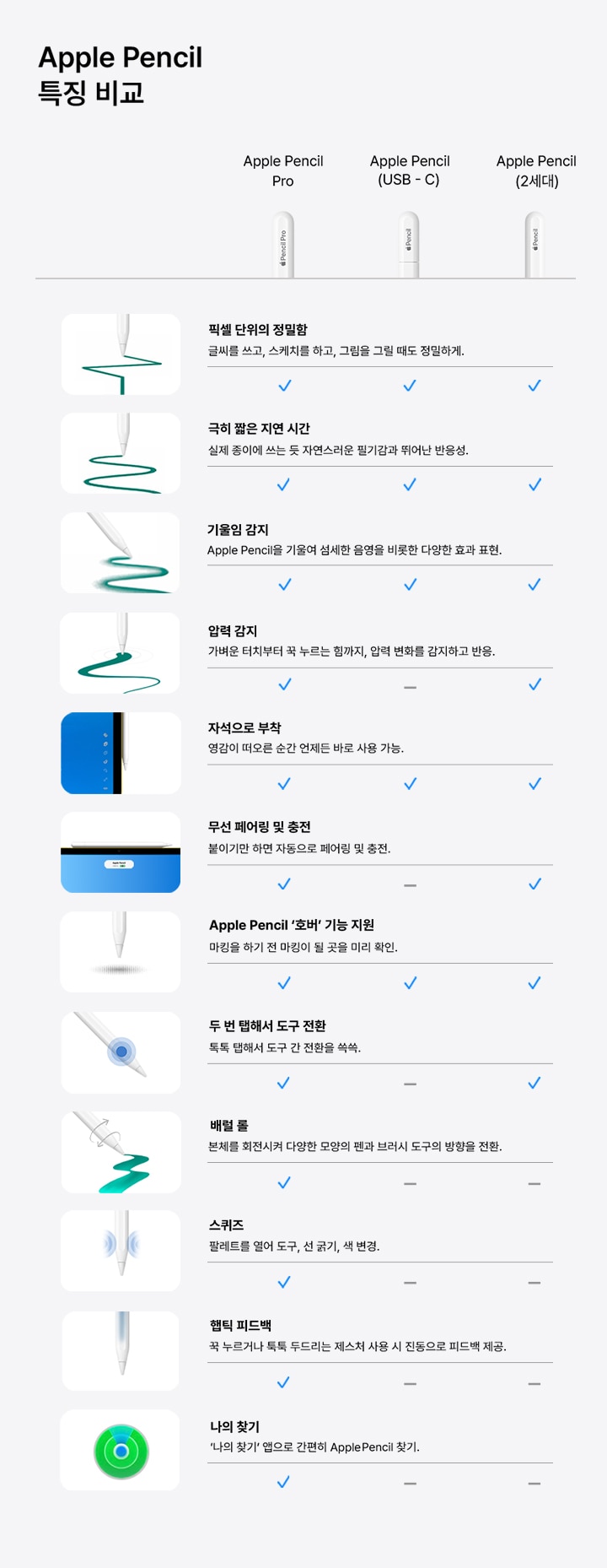 한결 더 마법 같은 방식으로 당신의 아이디어를 실현할 수 있도록 도와주는 Apple Pencil Pro. 새로운 첨단 기능들을 활용해 그 어느 때보다 직관적으로 마크업하고, 필기하고, 걸작을 완성할 수 있습니다. 스퀴즈. Apple Pencil Pro가 본체를 꾹 눌러 쥐는 스퀴즈 제스처를 감지해 새로운 팔레트를 표시해 줍니다. 덕분에 도구, 선 굵기, 색을 빠르게 바꿀 수 있습니다. 배럴 롤. 새로운 자이로스코프가 Apple Pencil Pro를 돌리는 정도에 따라 다양한 형태의 펜과 브러시 도구를 정밀하게 제어할 수 있도록 해줍니다. 햅틱 피드백. 맞춤형 햅틱 엔진이 정교한 피드백을 손끝에 전합니다. 스퀴즈 또는 두 번 탭 제스처를 취하면 해당 동작이 입력되었음을 알려주는 가벼운 진동을 느낄 수 있습니다. Apple Pencil 호버. Apple Pencil로 화면을 터치하기 전 Apple Pencil이 닿게 될 지점이 어딘지를 정확히 확인할 수 있고, 도구의 가상 그림자까지 표시됩니다. 덕분에 글씨를 쓰고, 스케치를 하고, 그림을 그릴 때 훨씬 정밀하게 작업할 수 있습니다. (Apple Pencil ‘호버’ 기능은 iPad Pro 13(M4 모델), iPad Pro 12.9(6세대), iPad Pro 11(M4 모델), iPad Pro 11(4세대), iPad Air 13(M2 모델) 및 iPad Air 11(M2 모델)에서 사용할 수 있습니다.) 두 번 탭. Apple Pencil을 톡톡 두드리는 두 번 탭 제스처로 펜과 지우개 등 여러 도구 간 전환을 빠르게 실행할 수 있습니다. 밖에서 또는 집에서 Apple Pencil Pro가 어디 있는지 못 찾겠을 땐 ‘나의 찾기’ 앱으로 간편히 찾을 수도 있습니다. Apple Pencil Pro는 iPad 옆면에 자석으로 부착해 페어링 및 충전할 수 있습니다.