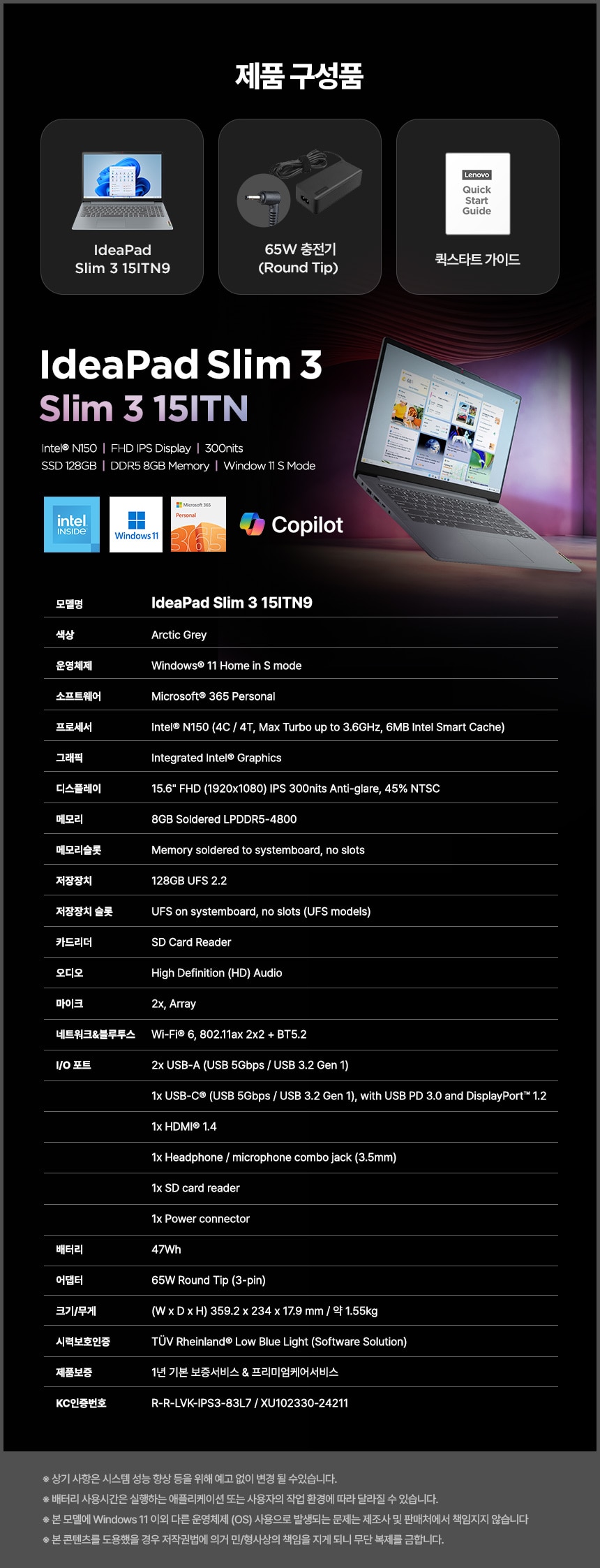 | 품명 | 레노버 아이디어패드슬림3i 39.6cm(15.6/N150/8GB/128GB) |