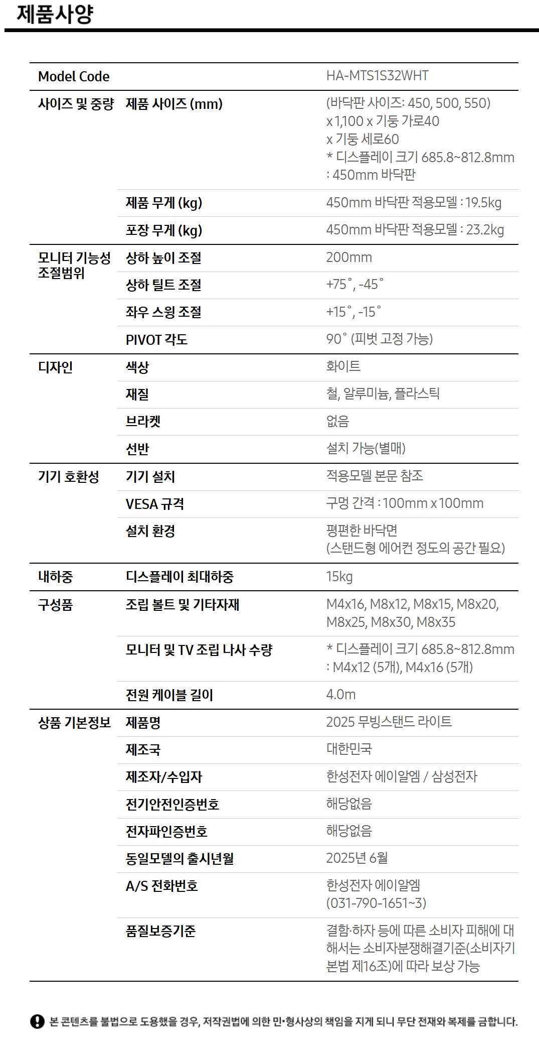 | A/S 책임자와 전화번호 또는 소비자상담 관련 전화번호 | 모니터: 삼성전자 1588-3366 2025 무빙스탠드 라이트: 한성전자 에이알엠 031-790-1651~3 |