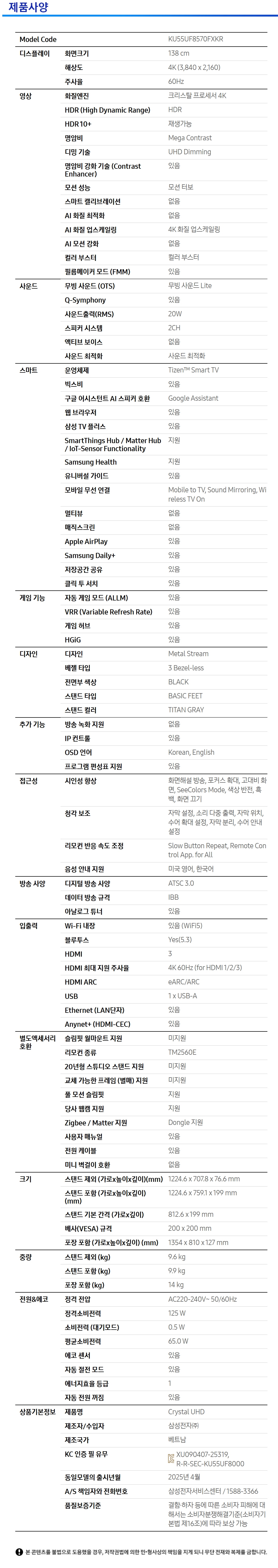 | 모델명 | KU55UF8570FXKR |