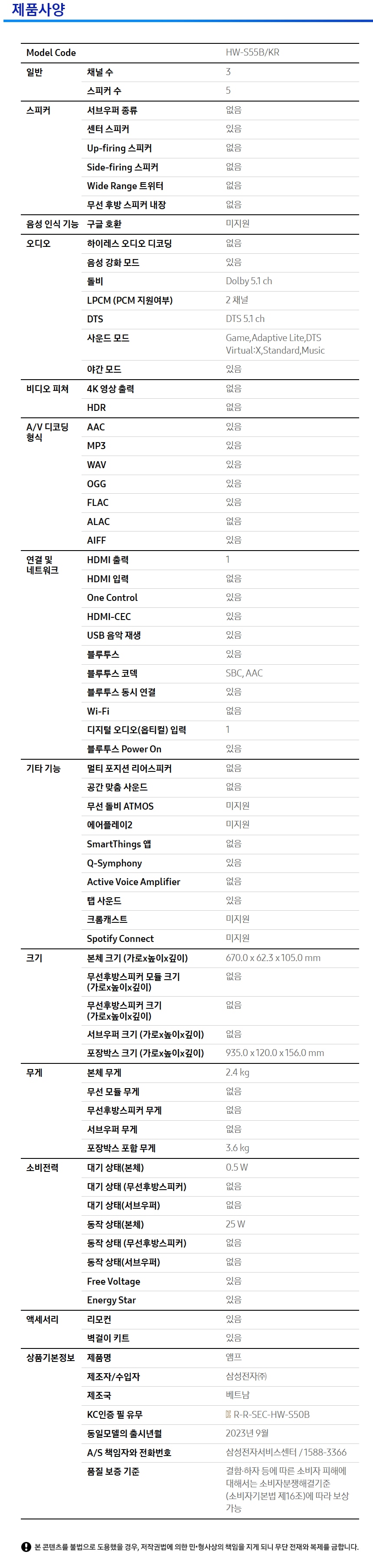 정격전압, 소비전력 | 스탠드형:220-240V / 50/60Hz / 220W 벽걸이형: 220-240V / 50/60Hz / 220W 사운드바: 해당 사항 없음 / 해당 사항 없음 / 25W |