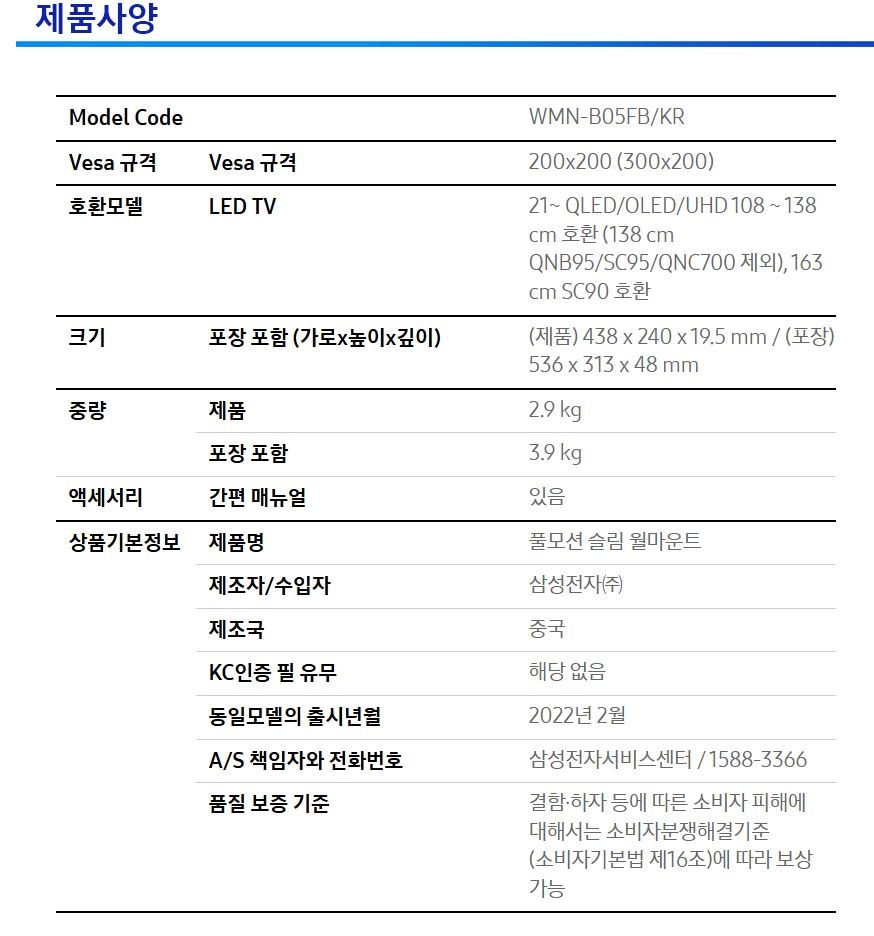품명 | 삼성 풀모션 슬림 벽걸이 WMN-B05FB (108~138,163cm) |