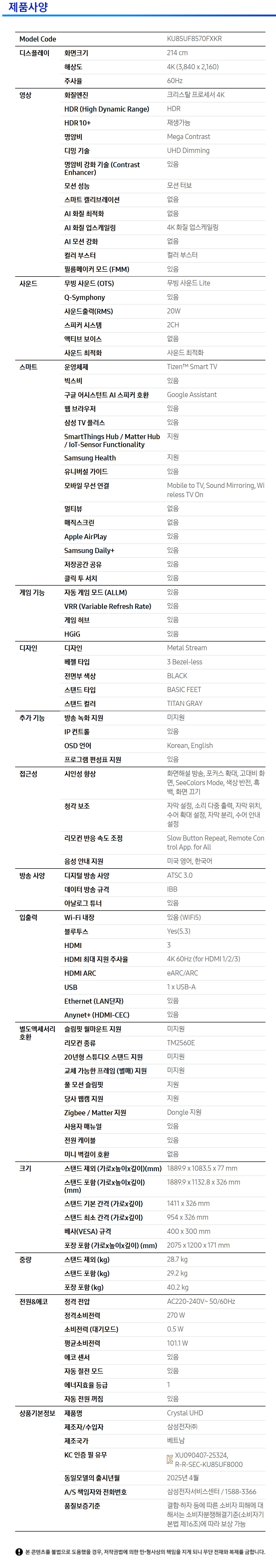 | 모델명 | KU85UF8570FXKR |
