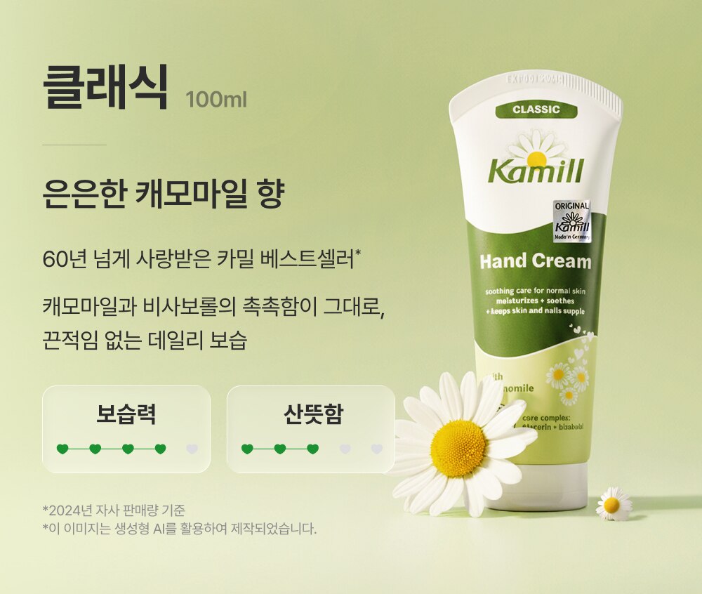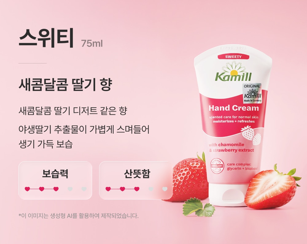 | 화장품법에 따라 기재.표시하여야 하는 모든성분 | 카밀 핸드크림 클래식 정제수, 에틸헥실스테아레이트, 글리세릴스테아레이트에스이, 글리세린, 하이드로제네이티드코코-글리세라이즈, 세테아릴알코올, 마트리카리아꽃추출물, 비사보롤, 락틱애씨드, 미리스틸알코올, 스테아릭애씨드, 팔미틱애씨드, 잔탄검, 벤질알코올, 페녹시에탄올, 프로필렌글라이콜, 카프릴릴글라이콜, 데실렌글라이콜, 향료, 헥실신남알, 리날룰, 부틸렌글라이콜, 리모넨, 시트로넬올, 알파-아이소메틸아이오논, 글루코오스, 시트랄, 소듐벤조에이트, 쿠마린, 제라니올, 포타슘솔베이트 카밀 마일드 솝 클래식 정제수, 소듐라우레스설페이트, 코카미도프로필베타인, 소듐클로라이드, 향료, 마트리카리아꽃추출물, 비사보롤, 글루코오스, 락틱애씨드, 코코-글루코사이드, 글리세릴올리에이트, 프로필렌글라이콜, 구아하이드록시프로필트라이모늄클로라이드, 부틸렌글라이콜, 시트릭애씨드, 포타슘솔베이트, 소듐벤조에이트 핸드크림 스위티 정제수, 글리세린, 다이카프릴릴에터, 코코글리세라이즈, 글리세릴스테아레이트, 하이드록시프로필스타치포스페이트, 글리세릴스테아레이트시트레이트, 스테아릴알코올, 아이소프로필팔미테이트, 데실올리에이트, 마트리카리아꽃추출물, 비사보롤, 글루코오스, 야생딸기추출물(400ppm), 향료, 잔탄검, 프로필렌글라이콜, 부틸렌글라이콜, 다이소듐포스페이트, 락틱애씨드, 시트릭애씨드, 페녹시에탄올, 카프릴릴글라이콜, 데실렌글라이콜, 포타슘솔베이트, 소듐벤조에이트, 벤질살리실레이트, 리모넨, 헥실신남알, 벤질알코올, 토코페롤, 하이드로제네이티드식물성글리세라이즈시트레이트 |
