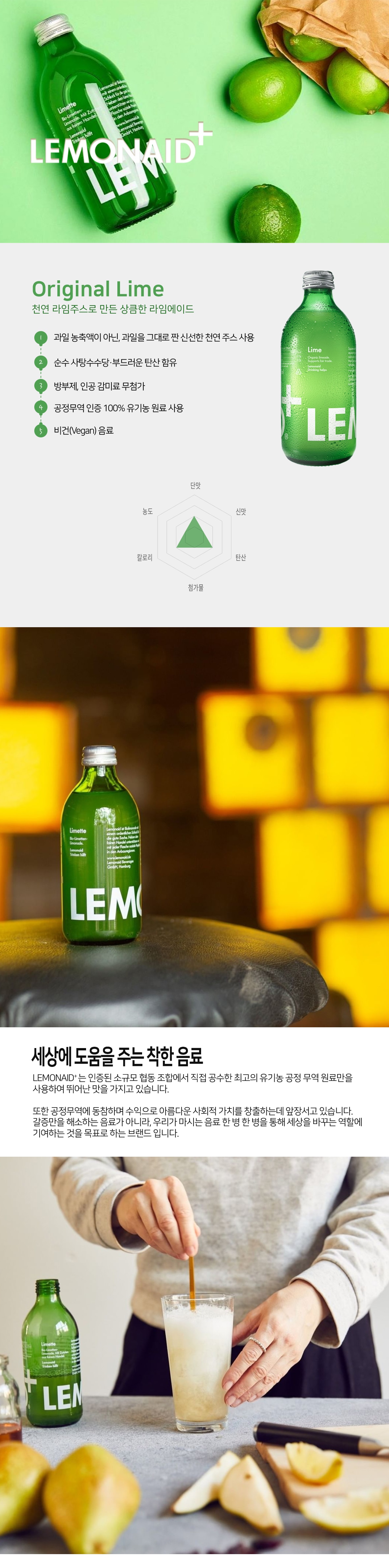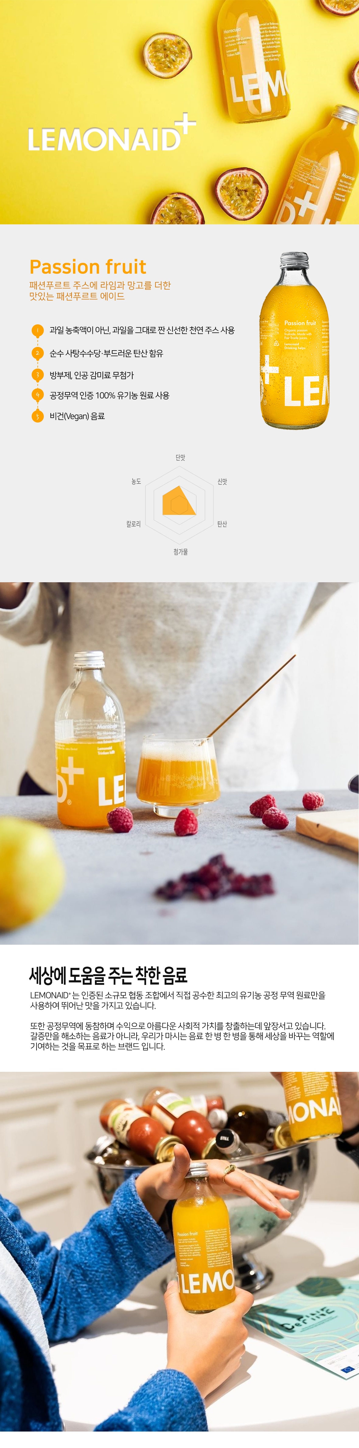 과일 농축액이 아닌, 과일을 그대로 짠 신선한 천연주스 사용, 방부제, 인공감미료 무첨가, 순수 사탕수수를 재료로 하는 공정무역 인증 100% 오가닉 레몬에이드