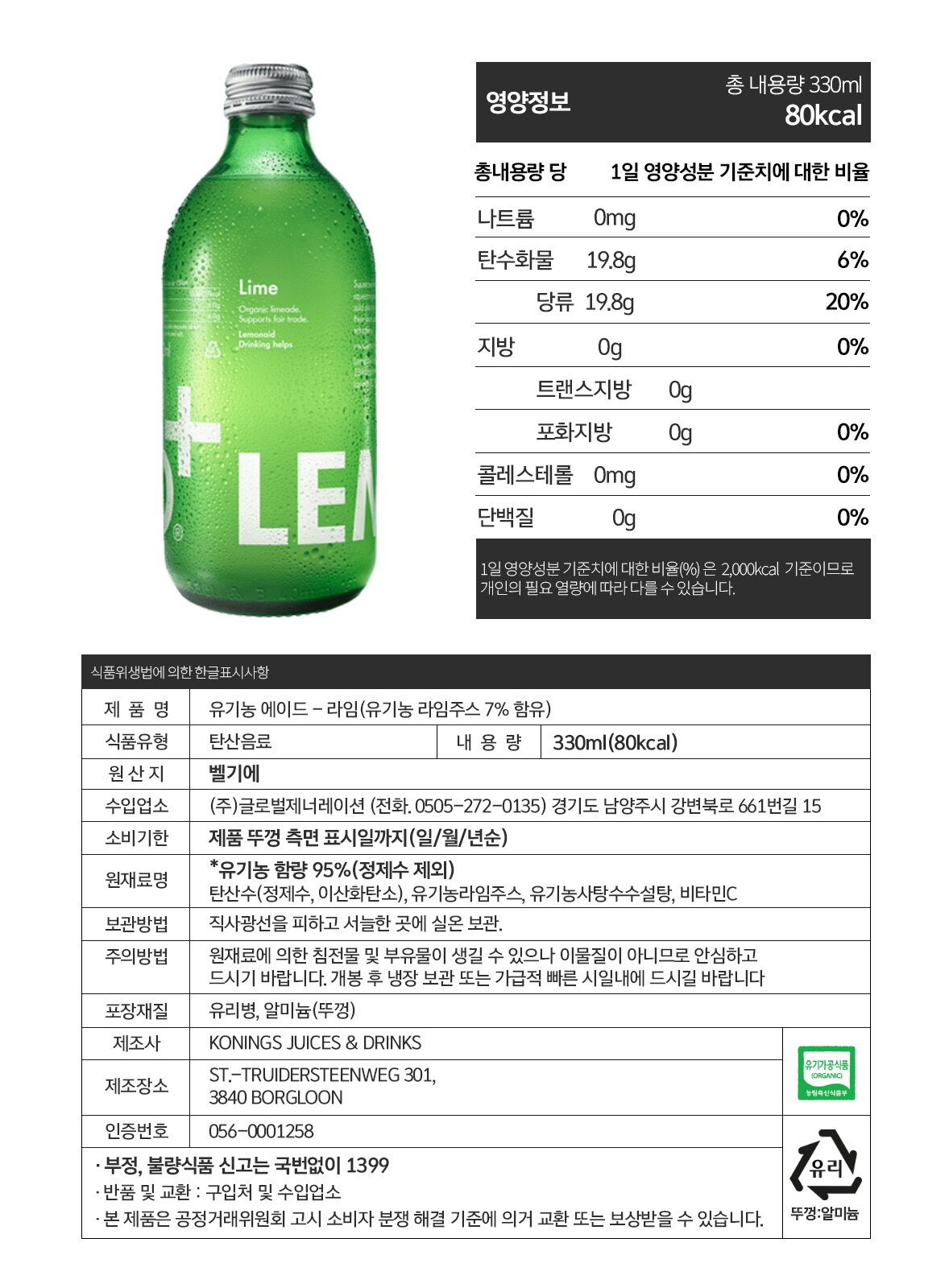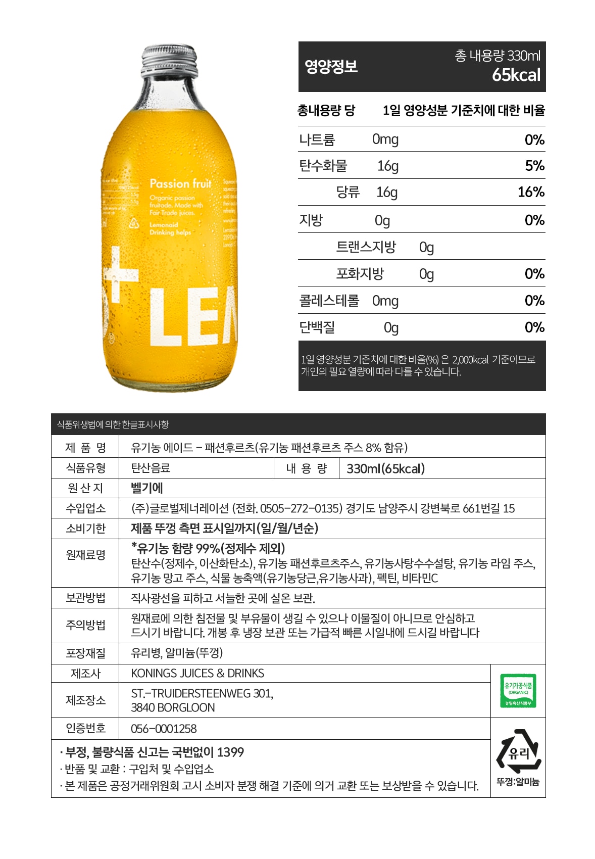 | 생산자 / 수입자 | KONINGS JUICES & DRINKS BV / ㈜ 글로벌제너레이션 |