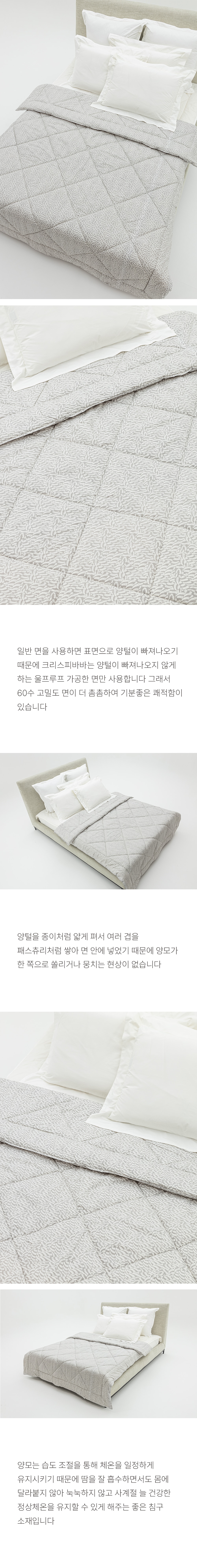 - 소재: 겉감 - 프리미엄 면 100% (60수 고밀도 평직, 울프루프 가공), 충전재 - 프랑스산 프리미엄 양모 100%