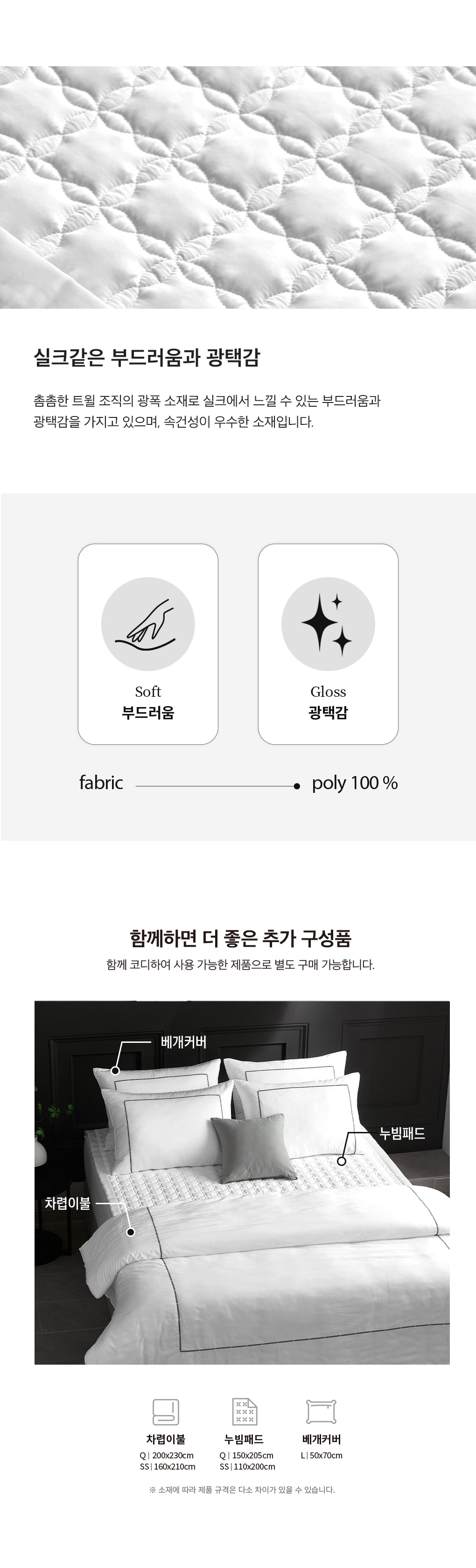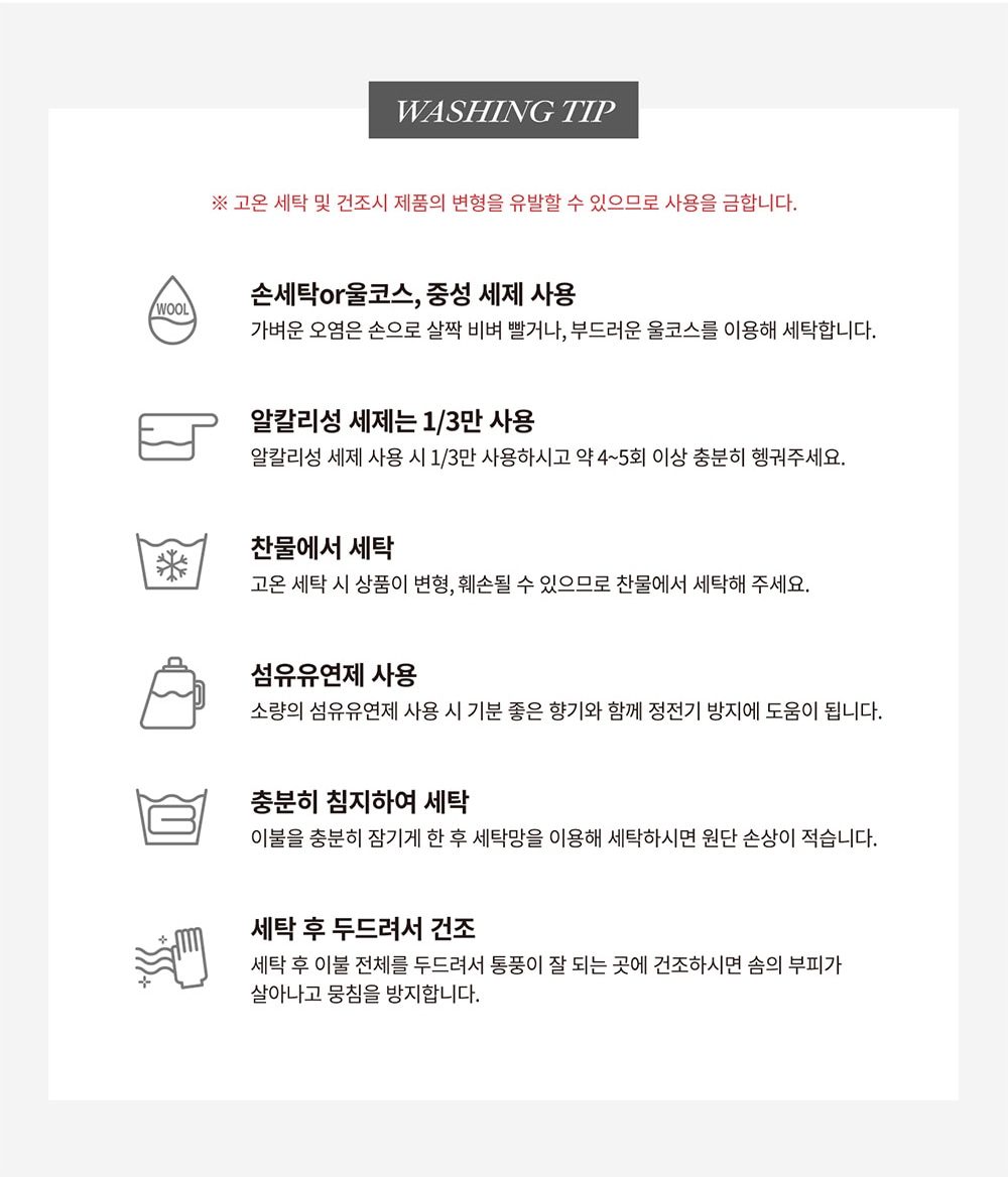 | 세탁방법 및 취급시 주의사항 | 중성세제를 사용하여 세탁해 주십시오. 가벼운 오염은 손으로 살짝 비벼 세탁하거나, 부드러운 울 코스를 이용해 세탁해 주십시오. 수축이 일어날 수 있으니 30℃ 이하의 물 온도에서 약하게 세탁해 주십시오. 삶거나 표백제를 사용할 경우 변형이 일어날 수 있으니 사용하지 마십시오. 가연성 소재로 불, 화기로부터 주의해 주십시오. 소량의 섬유 유연제 사용 시 기분 좋은 향기와 함께 정전기 방지에 도움이 됩니다. 세탁 후 패드 전체를 두드려서 통풍이 잘 되는 곳에 건조하시면 솜의 부피가 살아나고 뭉침을 방지할 수 있습니다. 세탁망을 사용하여 세탁해 주십시오. |