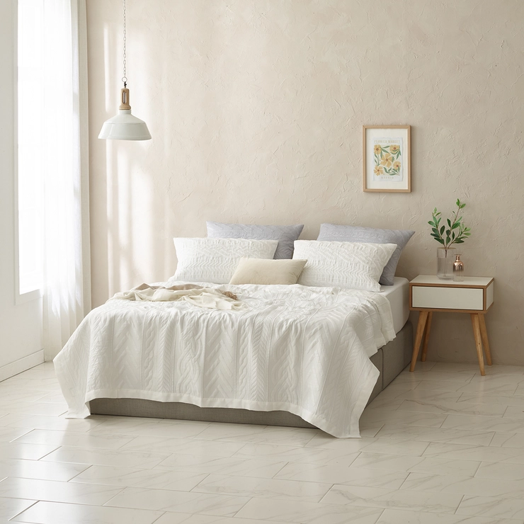 - 부드러운 곡선과 케이블 니트스타일의 패턴이 모던하게 재구성된 고급스러운 쟈가드 인견 스프레드입니다.