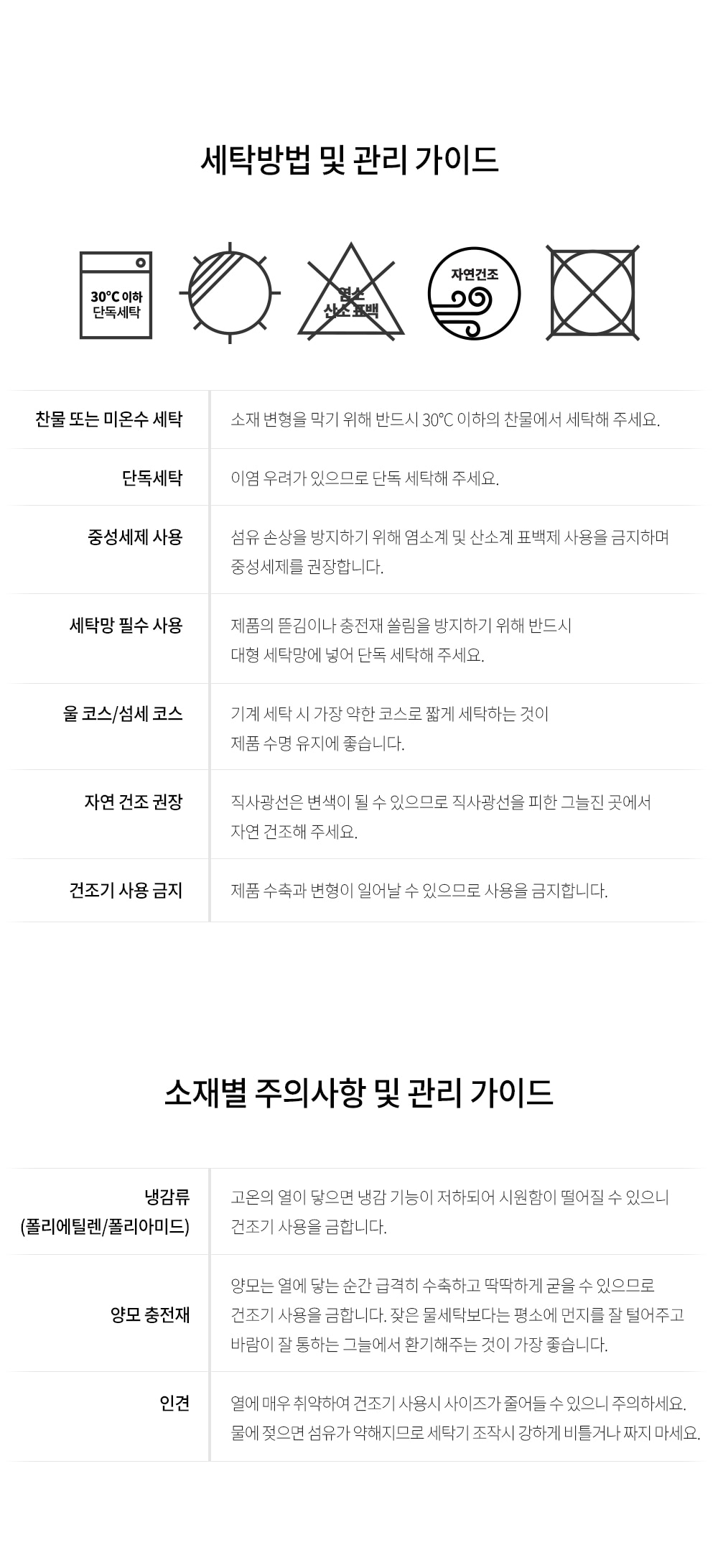 | 세탁방법 및 취급시 주의사항 | 찬물에 중성세제 사용, 단독세탁, 그늘 건조, 염소 및 표백금지, 기계건조 금지 |