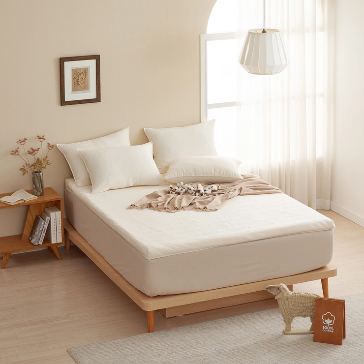 - 토퍼 커버는 OCS 인증 오가닉 100% 순면으로 만들어 피부에 자극이 적고 부드러우며, 3중직 누빔으로 내구성이 뛰어나 잦은 세탁에도 형태 변형이 거의 없고 보풀이 잘 일어나지 않습니다.