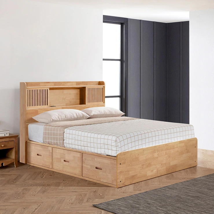 - 신혼부부나 성인들을 위한 침대로 3개의 수납 서랍과 2개의 수납통에 5개의 칸 분할이 된 수납공간이 있어 수납통에는 계절 이불이나 옷 등을 수납할 수 있고 수시로 입는 옷은 3개의 서랍에 나누어 정리할 수 있어 별도의 서랍장을 구매하지 않아도 되는 수납의 공간 효율성을 높인 침대입니다.