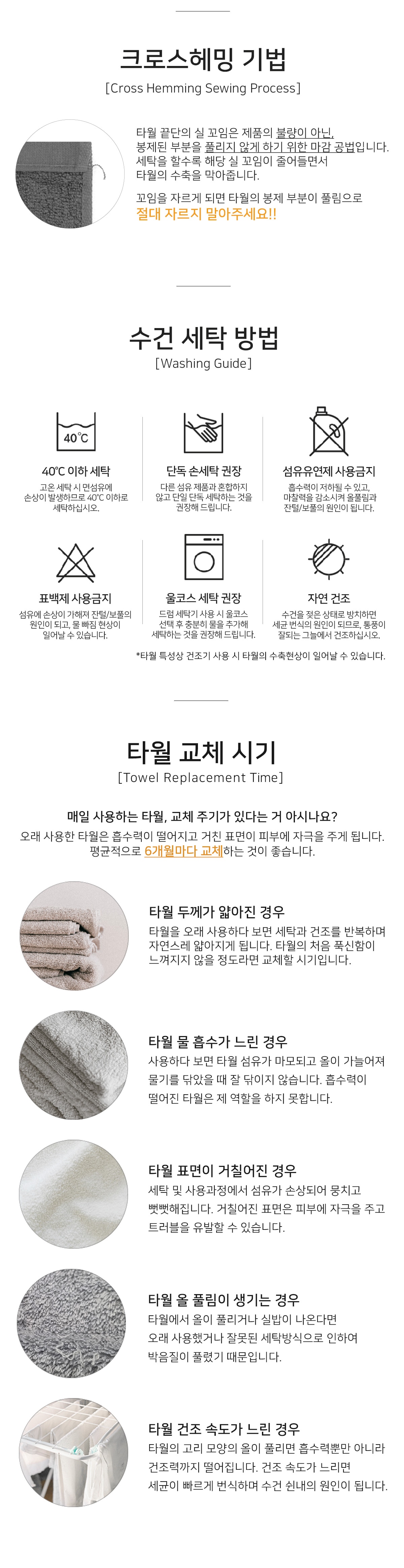 | 세탁방법 및 취급시 주의사항 | 처음 사용 시 세탁 후 사용 부탁드립니다. 이염이 될 수 있으니 짙은 색상의 제품은 다른 제품과 구별하여 세탁하시기 바랍니다. 드럼세탁기 사용 시 울 코스로 세탁해 주시기 바랍니다. 미온수에 약하게 세탁하여 주십시오. 섬유 유연제 사용 시 소량 사용해 주시기 바랍니다. 장시간 세제액에 담가두지 마십시오. 염소계 표백제 및 드라이클리닝, 다림질은 삼가 하여 주십시오. 삶거나 높은 온도에서 세탁하지 마십시오. 불이 붙기 쉽습니다. |