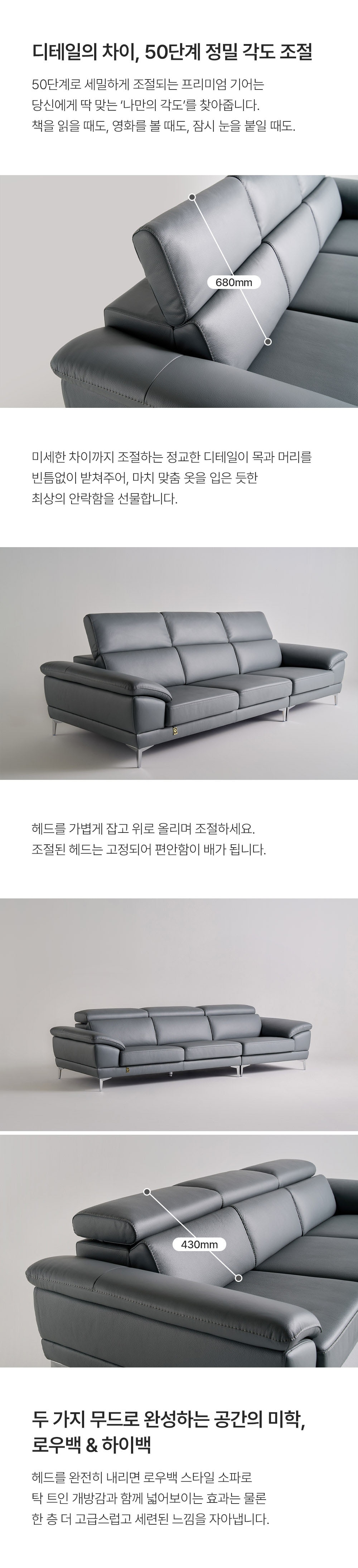 - 크기: [소파] W2940 x D1090 x H740(헤드레스트 올렸을 때 980) mm, [스툴] W780 x D600 x H430 mm